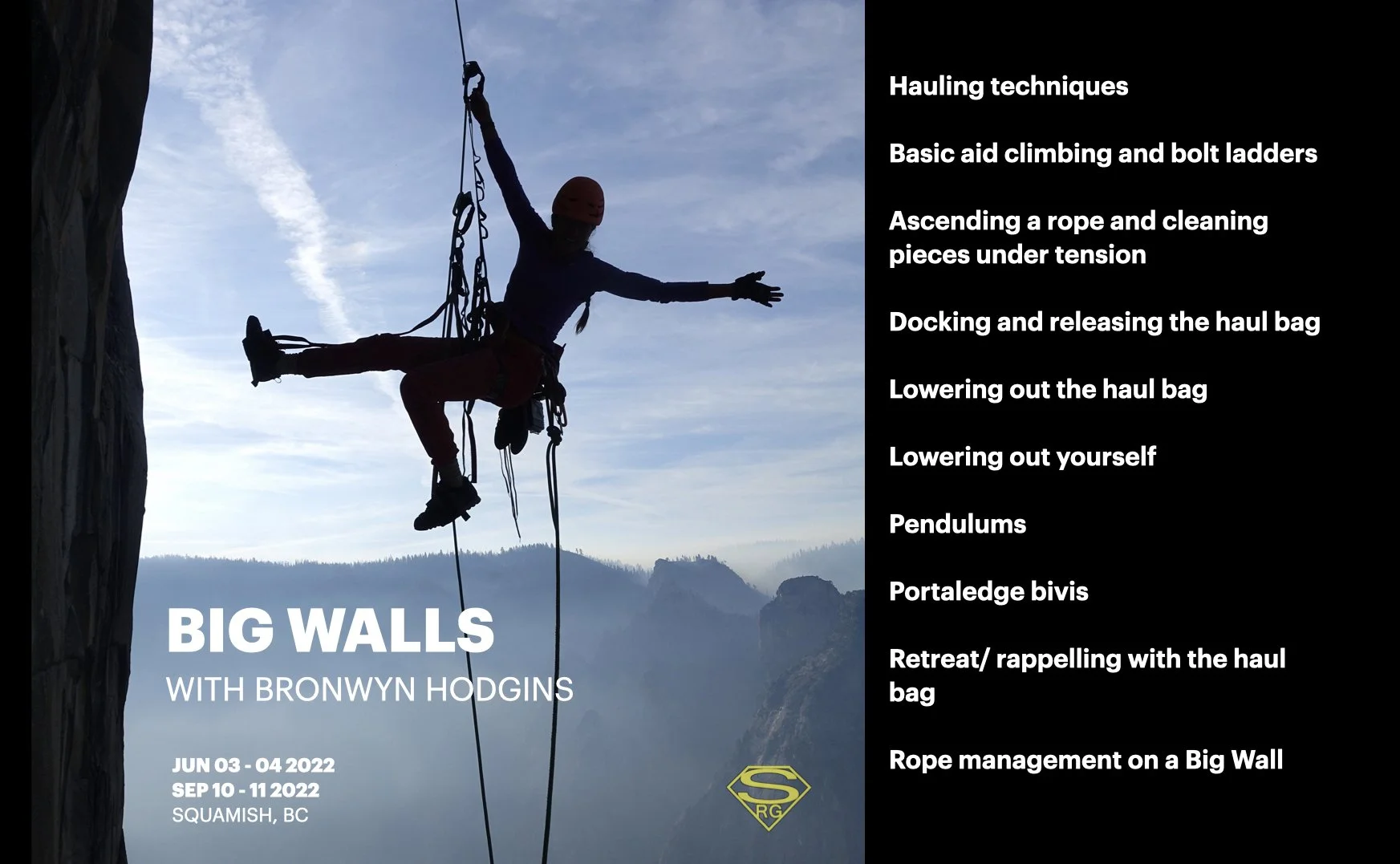 BIG WALL COURSE. Do you dream of climbing El Capitan in Yosemite? Do you want to climb a route over multiple days and sleep on the side of the cliff? Take your adventure climbing to the next level! This intensive two-day course will give you a solid start on your journey (in partnership with Squamish Rock Guides)